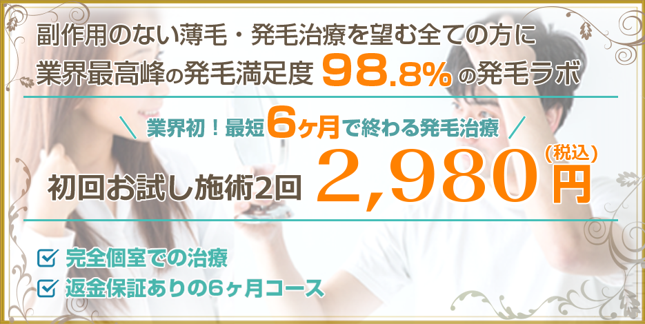 6ヶ月治療コース施術者の98.8%が発毛に成功しております。よくある育毛剤やAGAのお薬で産毛が生えたというレベルではない治療をお約束します。その為、当院では長野県岡谷、塩尻、下諏訪、諏訪、松本、茅野、伊那、原村、富士見、辰野エリアのお客さまにご安心いただき治療をお受けいただけるように、発毛担当医の治療計画をしっかりお守り頂いたうえで、発毛成果が出ない場合は、治療費を全額返金させて頂いております。